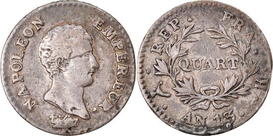 | | Coin, France, Napoléon I, 1/4 Franc, An 13 (1805), Bordeaux, , Silver | | | Napoléon I, Head right, Denomination within wreath | | FEATURES |