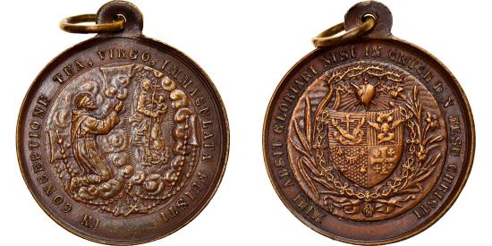 | | Vatican, Médaillette religieuse, Scène de prière à la Vierge, Religions & | | | VATICAN AND PAPAL STATES Médaillette religieuse, IN CONCEPTIONE TUA, VIRGO IMMACULATA FUISTI. Scène de prière à la Vierge., MIHUI ABSIT GLORIARI NISI IN CRUCE D. N. JESU CHRISTI. Écu surmonté d’une couronne d’épine avec un coeur saignant, entre deux branches de lys. | | FEATURES |