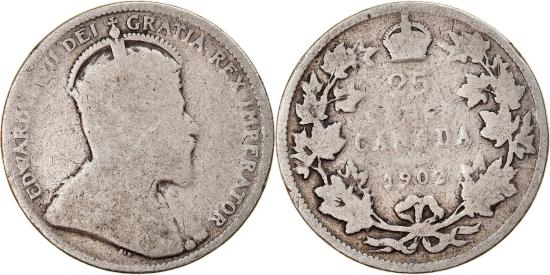 | | Coin, Canada, Edward VII, 25 Cents, 1902, Royal Canadian Mint, , Silver | | | Crowned bust right, Denomination and date within wreath, crown above, G. W. DeSaulles | | FEATURES |