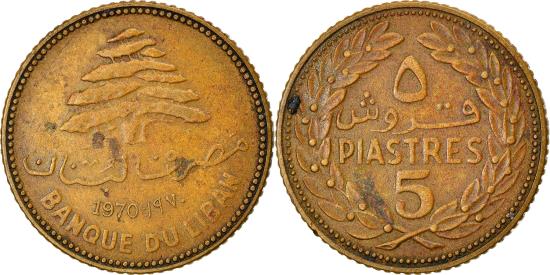 | | Coin, Lebanon, 5 Piastres, 1970, , Nickel-brass, KM:25.1 | | | Cedar tree above date, Value within wreath | | FEATURES |