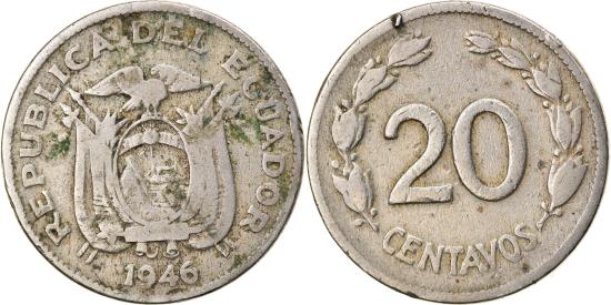 | | Coin, Ecuador, 20 Centavos, 1946, , Copper-nickel, KM:77.1b | | | Flag draped arms, date below, Denomination within wreath | | FEATURES |
