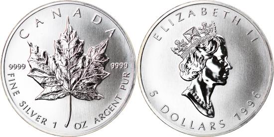 | | Coin, Canada, Elizabeth II, 5 Dollars, 1996, Royal Canadian Mint, Ottawa, BU | | | Crowned head right, date and denomination below, Maple leaf flanked by 9999, Dora de Pedery-Hunt | | FEATURES |