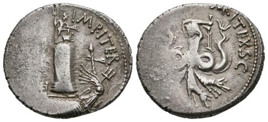 | SEXTO POMPEYO. Denario. (Ar. 3,87g/20mm). 42-40 a.C. Sicilia. Anv: MAG PIVS IMP ITER. Faro de Mesina coronado por la estatua de Neptuno, delante galera, sobre ella a izquierda águ |