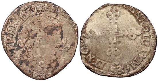 AR Double Sol Parisis 3.87g. 27mm. 1583-S Troyes Mint. Voided cross fleuronée. s.SIT•NOMEN [•DOMI] NI•BENEDICTUM '>8 Crowned 'H' monogram flanked bt three fleur-de-lis. *HENRI [CVS•III•D•G] FRANC ET•P•REX 1583 Duplessy 1136; Roberts 3391 Toned. Some minor porosity and encrustation.