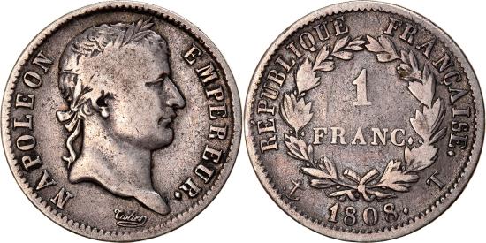 | | Coin, France, Napoléon I, Franc, 1808, Nantes, , Silver, KM:682.12 | | | Napoléon I, Laureate head right, Denomination within wreath | | FEATURES |