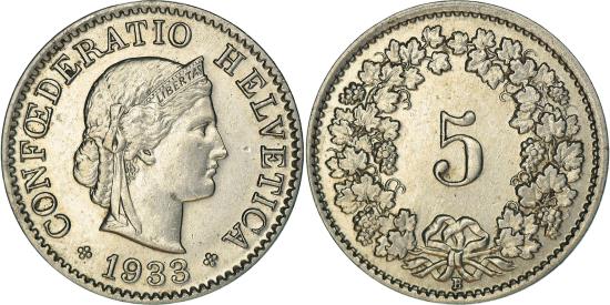 | | Coin, Switzerland, 5 Rappen, 1933, Bern, , Nickel, KM:26b | | | Crowned head right, Value within wreath, Retired legal tender status as of January 1, 2004, removed from circulation., Karl Schwenzer | | FEATURES |