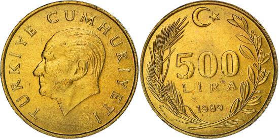 | | #[380654] COIN, TURKEY, 500 LIRA, 1989, , ALUMINUM-BRONZE, KM:989 | | | Head of Atat | | Value and date within wreath | | Varieties exist. | | CHARACTERISTICS |