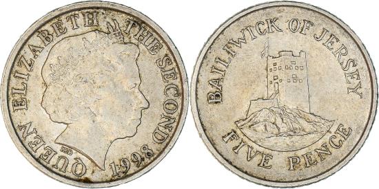| | Coin, Jersey, Elizabeth II, 5 Pence, 1998, , Copper-nickel, KM:105 | | | Head with tiara right, Seymour Tower, Grouville, L'Avathigon, Ian Rank-Broadley | | FEATURES |