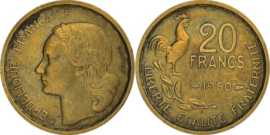 | | Coin, France, Guiraud, 20 Francs, 1950, Paris, , Aluminum-Bronze | | | Guiraud, Head left, GEORGES GUIRAUD behind head, Denomination above date at right, rooster above laurel branch at left, The 4-plume variety has been identified as a counterfeit. | | FEATURES |