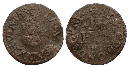 | 17th Century Token, Suffolk, Bury St Edmunds, Henry Headache, Farthing, undated, Bacchus on a barrel, legend and toothed border surrounding, *HENRY. HEADACH. VINTNR, last two letters ligatured, rev. *H* over H.M at centre. .*. below all within beaded circle, legend and toothed border surrounding, *AT. ST EDMONDSBVRY, weight 0.55g (Norweb 4280; Boyne 50; B.W.62). Toned with a little porosity at centre, good fine and a seemingly appropriate surname for a Vintner supplying alcohol. |