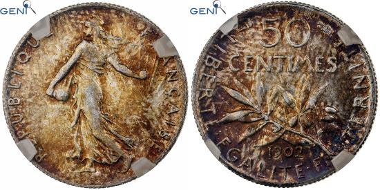 | | France, 50 Centimes, Semeuse, 1902, Paris, Silver, GENI, | | | Sower advancing left., Denomination above olive branch. Date below., Graded GENI . | | FEATURES |