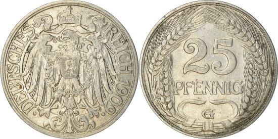 | | Coin, GERMANY - EMPIRE, Wilhelm II, 25 Pfennig, 1909, Karlsruhe, | | | Crowned imperial eagle with shield on breast, Denomination within wreath | | FEATURES |