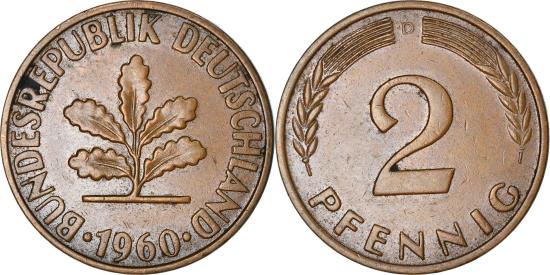 | Coin, GERMANY - FEDERAL REPUBLIC, 2 Pfennig, 1960, Munich, , Bronze |