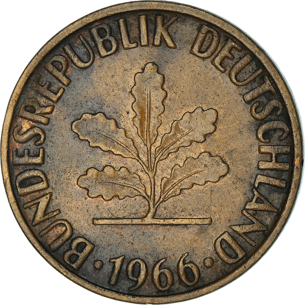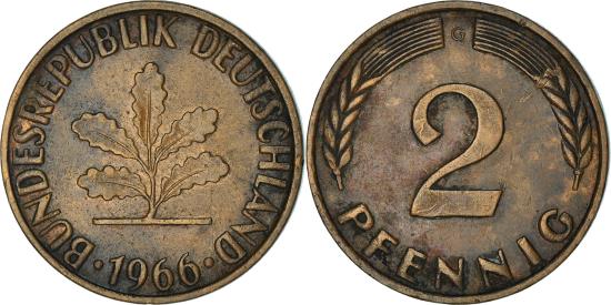 | | #[838724] COIN, GERMANY - FEDERAL REPUBLIC, 2 PFENNIG, 1966, KARLSRUHE, , BRONZE | | | Five oak leaves, date below | | Denomination | | CHARACTERISTICS |