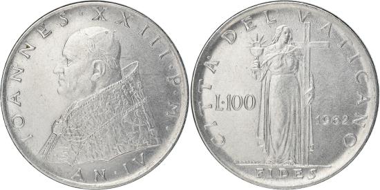 | | Coin, VATICAN CITY, John XXIII, 100 Lire, 1962, , Stainless Steel, KM:73 | | | Bust left, Bishops at council meeting with radiant doves | | FEATURES |