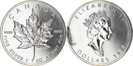 | | Coin, Canada, Elizabeth II, 5 Dollars, 1994, Royal Canadian Mint, Ottawa | | | Crowned head right, date and denomination below, Maple leaf flanked by 9999, Dora de Pedery-Hunt | | FEATURES |