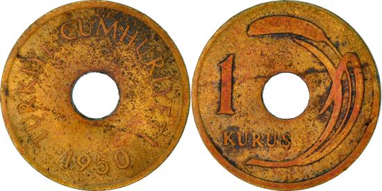 | | #[839054] COIN, TURKEY, KURUS, 1950, , BRASS, KM:881 | | | Date below hole in center | | Hole in center flanked by oat sprig and value | | CHARACTERISTICS |