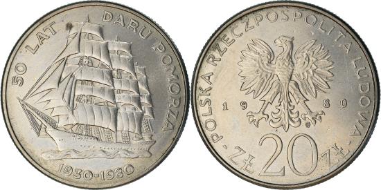 | | Coin, Poland, 20 Zlotych, 1980, Warsaw, , Copper-nickel, KM:112 | | | Imperial eagle above value, Sailing ship | | FEATURES |