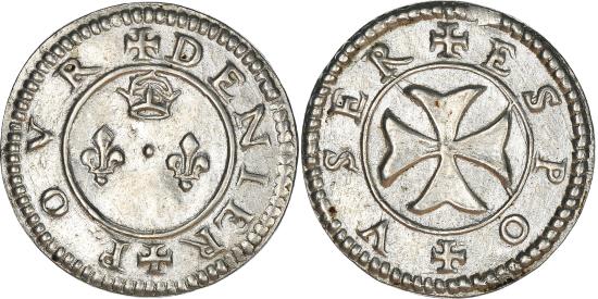 Ces objets fragiles se retrouvent le plus souvent dépareillés, car la boîte est les deniers sont régulièrement dispersés voire perdus au fil des générations. Les rares exemplaires qui nous sont parvenus sont ainsi de précieux témoignages d'une Histoire du mariage dans l'Occident chrétien, mais également d'une histoire intime d'un couple ayant échangé leurs vœux de fidélité devant l'autel., Deux fleurs de lys séparées par un point central ; au dessus, une couronne., Croix pattée., Exemplaire provenant de la Collection personnelle de M. Henri Térisse, auteur de l'ouvrage La Numismatique du Mariage (2016).