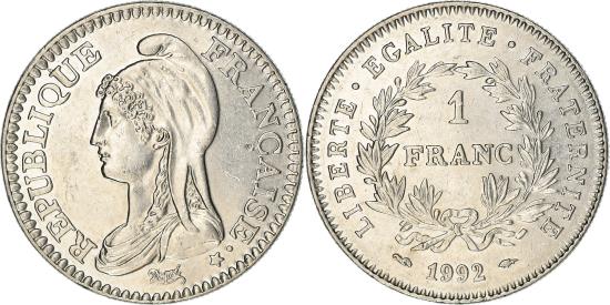 | | Coin, France, République, Franc, 1992, Paris, , Nickel, KM:1004.1 | | | République, Liberty bust left, Denomination within wreath, date below | | FEATURES |