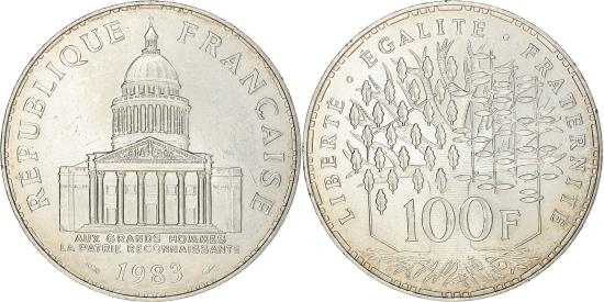 | | Coin, France, Panthéon, 100 Francs, 1983, Paris, , Silver, KM:951.1 | | | Panthéon, Pantheon, date below, Leafy design above denomination, Without mint mark. | | FEATURES |