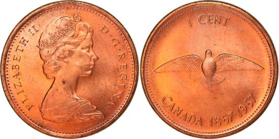 | | Coin, Canada, Elizabeth II, Cent, 1967, Royal Canadian Mint, Ottawa, | | | Queen's bust right, Dove with wings spread, denomination above, two dates below, Arnold Machin | | FEATURES |