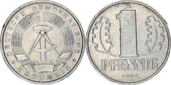| | Coin, GERMAN-DEMOCRATIC REPUBLIC, Pfennig, 1960, Berlin, , Aluminum | | | State emblem, Denomination flanked by oak leaves, date below | | FEATURES |