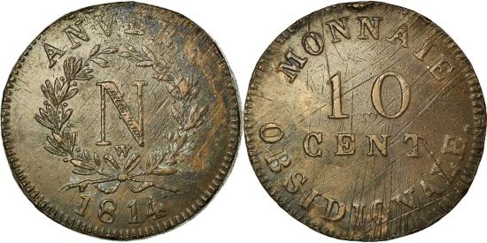 | | Coin, FRENCH STATES, ANTWERP, 10 Centimes, 1814, Anvers, , Bronze | | | N monogram within wreath, W above ribbon bow, Denomination | | FEATURES |