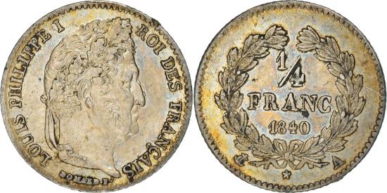 | | Coin, France, Louis-Philippe, 1/4 Franc, 1840, Paris, , Silver | | | Louis-Philippe, Laureate head right, Denomination within wreath, LOUIS PHILIPPE I ROI DES FRANCAIS | | FEATURES |