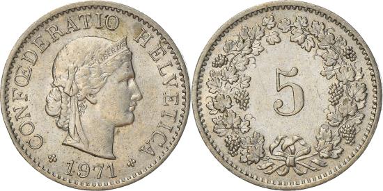 | | Coin, Switzerland, 5 Rappen, 1971, Bern, , Copper-nickel, KM:26 | | | Crowned head right, Value within wreath, CONFOEDERATIO HELVETICA Karl Schwenzer | | FEATURES |