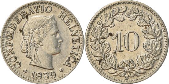 | | Coin, Switzerland, 10 Rappen, 1939, Bern, , Nickel, KM:27b | | | Crowned head right, Value within wreath, Retired legal tender status as of January 1, 2004, removed from circulation but still redeemable., Karl Schwenzer | | FEATURES |