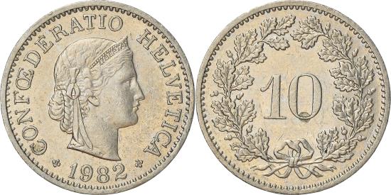 | | Coin, Switzerland, 10 Rappen, 1982, Bern, , Copper-nickel, KM:27 | | | Crowned head right, Value within wreath, CONFOEDERATIO HELVETICA Karl Schwenzer | | FEATURES |