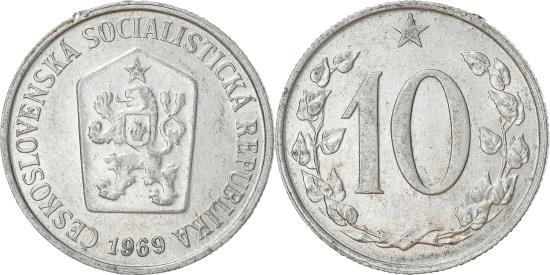 | | Coin, Czechoslovakia, 10 Haleru, 1969, , Aluminum, KM:49.1 | | | Star above Czech lion with socialist shield within shield, Large denomination within linden wreath, star above | | FEATURES |