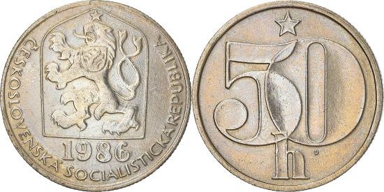 | | Coin, Czechoslovakia, 50 Haleru, 1986, , Copper-nickel, KM:89 | | | Czech lion with socialist shield within shield, thick date below, Thick denomination, star above, Date varieties exist. | | FEATURES |