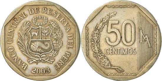 | | Coin, Peru, 50 Centimos, 2003, Lima, , Copper-Nickel-Zinc, KM:307.4 | | | National arms, accent above u, Without braille, accent above e, LIMA monogram is mint mark. | | FEATURES |