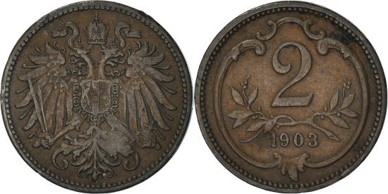 | | Coin, Austria, Franz Joseph I, 2 Heller, 1903, , Bronze, KM:2801 | | | Crowned imperial double eagle, Value above sprays, date below within shield | | FEATURES |