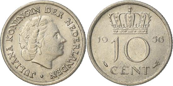 | | Coin, Netherlands, Juliana, 10 Cents, 1956, , Nickel, KM:182 | | | Head right, Crowned value divides date | | FEATURES |