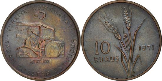 | | Coin, Turkey, 10 Kurus, 1971, , Bronze, KM:898.1 | | | Atat, Oat stalks divide value and date, M. Duyer | | FEATURES |