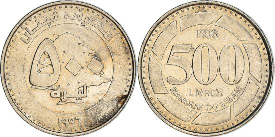 | | Coin, Lebanon, 500 Livres, 1996, , Nickel plated steel, KM:39 | | | Arabic legend above large value on cedar tree, Large value 500, thick segmented circular border | | FEATURES |