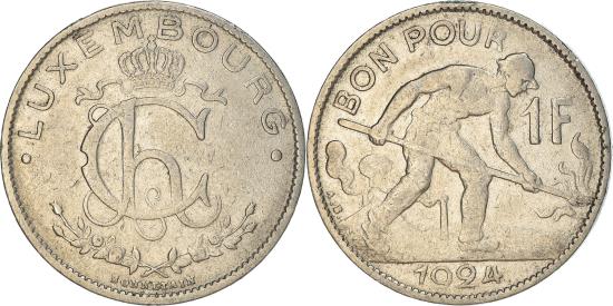 | | Coin, Luxembourg, Charlotte, Franc, 1924, , Nickel, KM:35 | | | Crowned monogram, Man in industrial scene | | FEATURES |