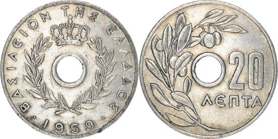 | | Coin, Greece, Paul I, 20 Lepta, 1959, Paris, , Aluminum, KM:79 | | | Center hole within crowned wreath, Olive branch left of center hole | | FEATURES |