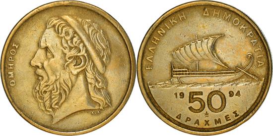 | | Coin, Greece, 50 Drachmes, 1994, , Aluminum-Bronze, KM:147 | | | Ancient sailing boat, Head left | | FEATURES |