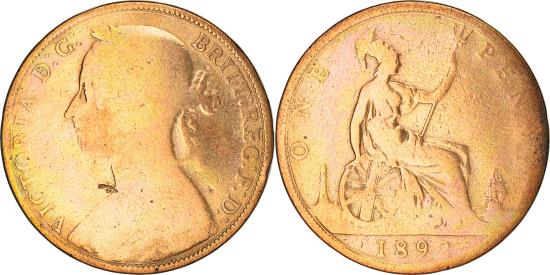 | | Coin, Great Britain, Victoria, Penny, 1892, , Bronze, KM:755 | | | Mature bust, without die number, Britannia seated right, VICTORIA D:G: BRITT: REG: F:D: | | FEATURES |