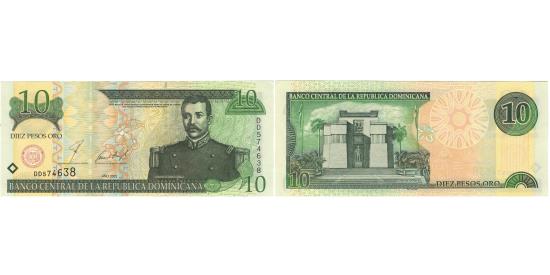 | | Banknote, Dominican Republic, 10 Pesos Oro, 2001, 2001, KM:168a, UNC(63) | | | 2001. Yellow to left on both sides., Matí as Ramón Mella at right. Wide border printing at upper center right., Altar de la Patria., Dark green on multicolor underprint. | | FEATURES |
