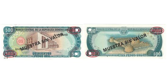 | | Banknote, Dominican Republic, 500 Pesos Oro, 1994, 1994, Specimen, KM:137s2 | | | 1994. Specimen with black overprint: MUESTRA SIN VALOR and red overprint: TDLR oval seals., National Theater at center, orange bank seal at left. Silver leaf-like underlays at left and right., Fort San Felipe at center right, dates in upper margin., Deep blue, blue and dark brown on multicolor underprint. | | FEATURES |