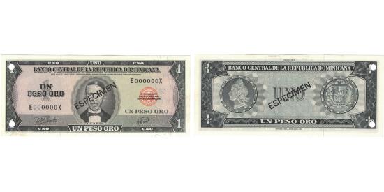 | | Banknote, Dominican Republic, 1 Peso Oro, 1978, 1978, Specimen, KM:117s1 | | | Specimen with black overprint: ESPECIMEN. on both sides. 1980. Punch hole cancelled., J. P. Duarte at right, orange bank seal at left., Sugar refinery, dates (lightly printed) in upper margin., Black, dark green and dark brown on multicolor underprint. | | FEATURES |