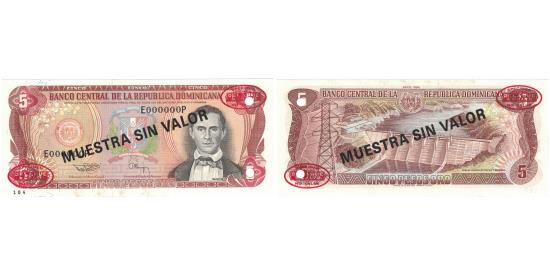 Banknote, Dominican Republic, 5 Pesos Oro, 1994, 1994, Specimen, KM:146sBanknote, Dominican Republic, 5 Pesos Oro, 1994, 1994, Specimen, KM:146s