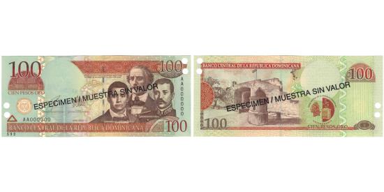 | | Banknote, Dominican Republic, 100 Pesos Oro, 2002, 2002, Specimen, KM:171s2 | | | 2002. Specimen. Overprint: ESPECIMEN / MUESTRA SIN VALOR in black on both sides. Punch hole cancelled., F. R. Sanches, J. P. Duarte and M. R. Mella at right. Wide border printing at upper center right., Puerta del Conde at left., Dark brown and orange on multicolor underprint. | | FEATURES |