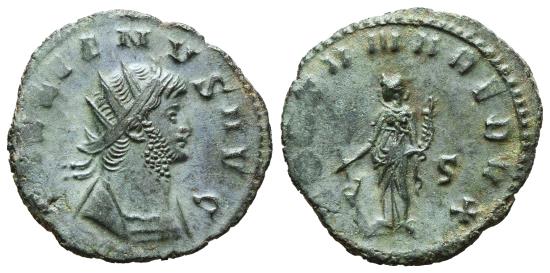 GALLIENUS. Ae, Antoninianus. AD 265-266. Rome. Obv/ GALLIENVS AVG Radiate and cuirassed bust of Gallienus to right. Rev/ FORTVNA REDVX Fortuna standing front, head to left, holding rudder set on globe in her right hand and cornucopiae in her left; in field to right, ζ. Cat: RIC 193 var.; MIR 586 w. Bronze (Ae) 3,00g - 22mm. Extremely fine. Beautiful patina. |