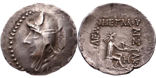 Obverse: head left in bashlyk Reverse: archer seated right on omphalos, three line legend, H